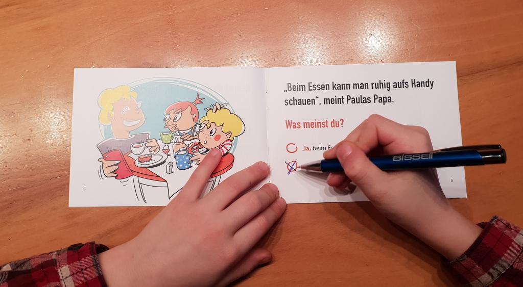 Um ins Thema Medienkonsum einzuführen, hilft auch das mitgelieferte Quizheft mit Comics zum Familienalltag. Man kann mit dem Kind zusammen ein paar Fragen beantworten, so dass man so ganz einfach ins Gespräch kommt zum Thema Smartphone-Nutzung im Familienalltag.